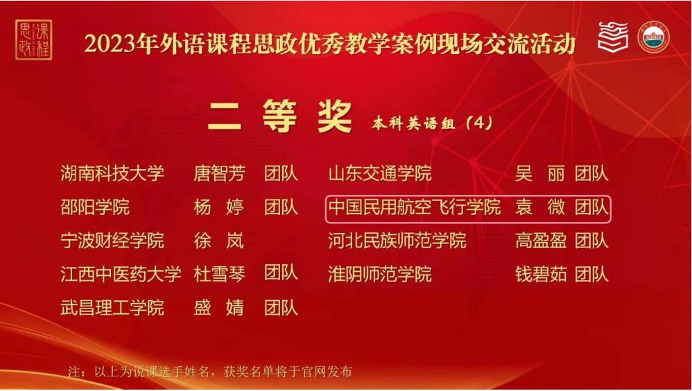 由国际合作部袁微副教授和beat365英国官网网站叶家春副教授、黄思杰老师组成的团队以此项赛事四川省英语专业组特等奖身份入围全国交流活动。此次活动赛制为随机抽取文本材料,参赛教师经过90分钟的现场准备,基于指定素材对课程思政教学设计进行说课展示,然后回答评委提问。现场赛制对于教师的教学基本功、临场应变能力和文本思政元素提炼能力都是极大的挑战。经过激烈角逐,团队最终斩获全国二等奖。