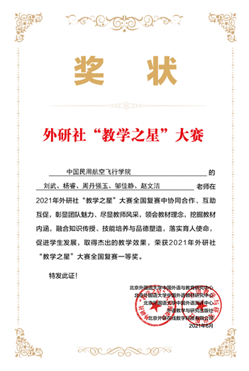 6月17日,2021年外研社“教学之星”全国复赛获奖名单新鲜出炉,大赛主题为“外语教材的有效使用:培根铸魂,启智增慧”。自赛事发布以来,经全国各院校选拔推荐,共有667个教学团队参加复赛,其中大学英语组395个、英语类专业组272个。最终,beat365英国官网网站飞行基础英语教研室主任刘武副教授带领团队获得大学英语组全国复赛一等奖。这也是刘武团队自去年年底,在高教杯首届全国高校外语课程思政教学比赛拿到大学英语组四川省一等奖和全国二等奖后,短短数月在又一外语重要赛事中取得的优异成绩,突显了团队精神,充分展现了团队实力。