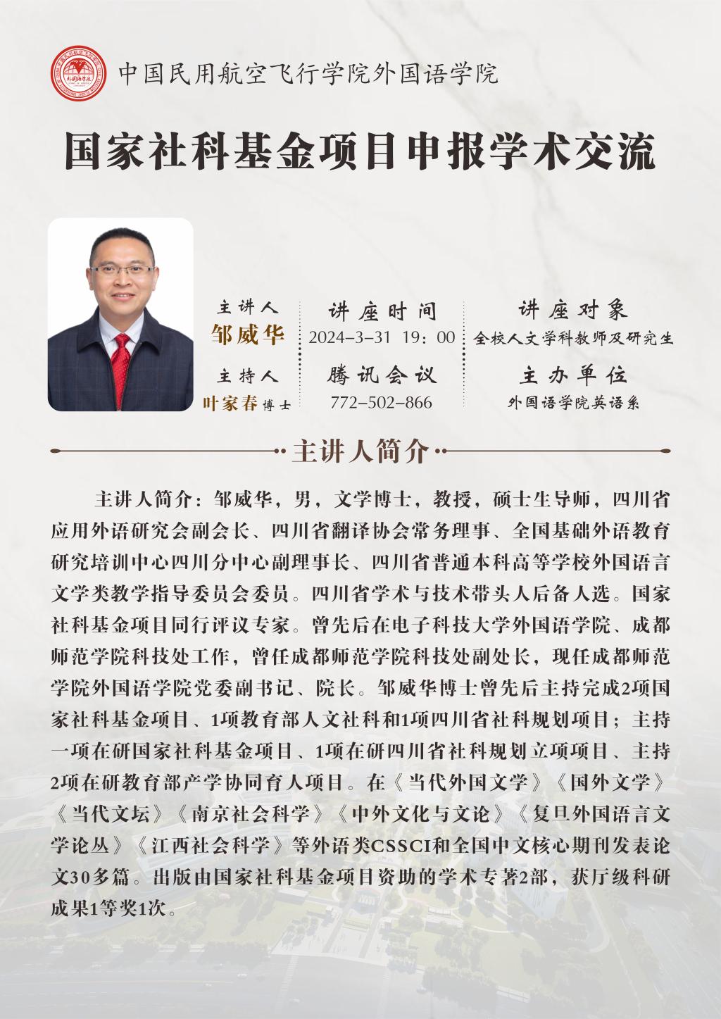 主讲人简介:邹威华,男,文学博士,教授,硕士生导师,四川省应用外语研究会副会长、四川省翻译协会常务理事、全国基础外语教育研究培训中心四川分中心副理事长、四川省普通本科高等学校外国语言文学类教学指导委员会委员。四川省学术与技术带头人后备人选。国家社科基金项目同行评议专家。曾先后在电子科技大学beat365英国官网网站、成都师范学院科技处工作,曾任成都师范学院科技处副处长,现任成都师范学院beat365英国官网网站党委副书记、院长。邹威华博士曾先后主持完成2项国家社科基金项目、1项教育部人文社科和1项四川省社科规划项目;主持一项在研国家社科基金项目、1项在研四川省社科规划立项项目、主持2项在研教育部产学协同育人项目。在《当代外国文学》《国外文学》《当代文坛》《南京社会科学》《中外文化与文论》《复旦外国语言文学论丛》《江西社会科学》等外语类CSSCI和全国中文核心期刊发表论文30多篇。出版由国家社科基金项目资助的学术专著2部,获厅级科研成果1等奖1次。