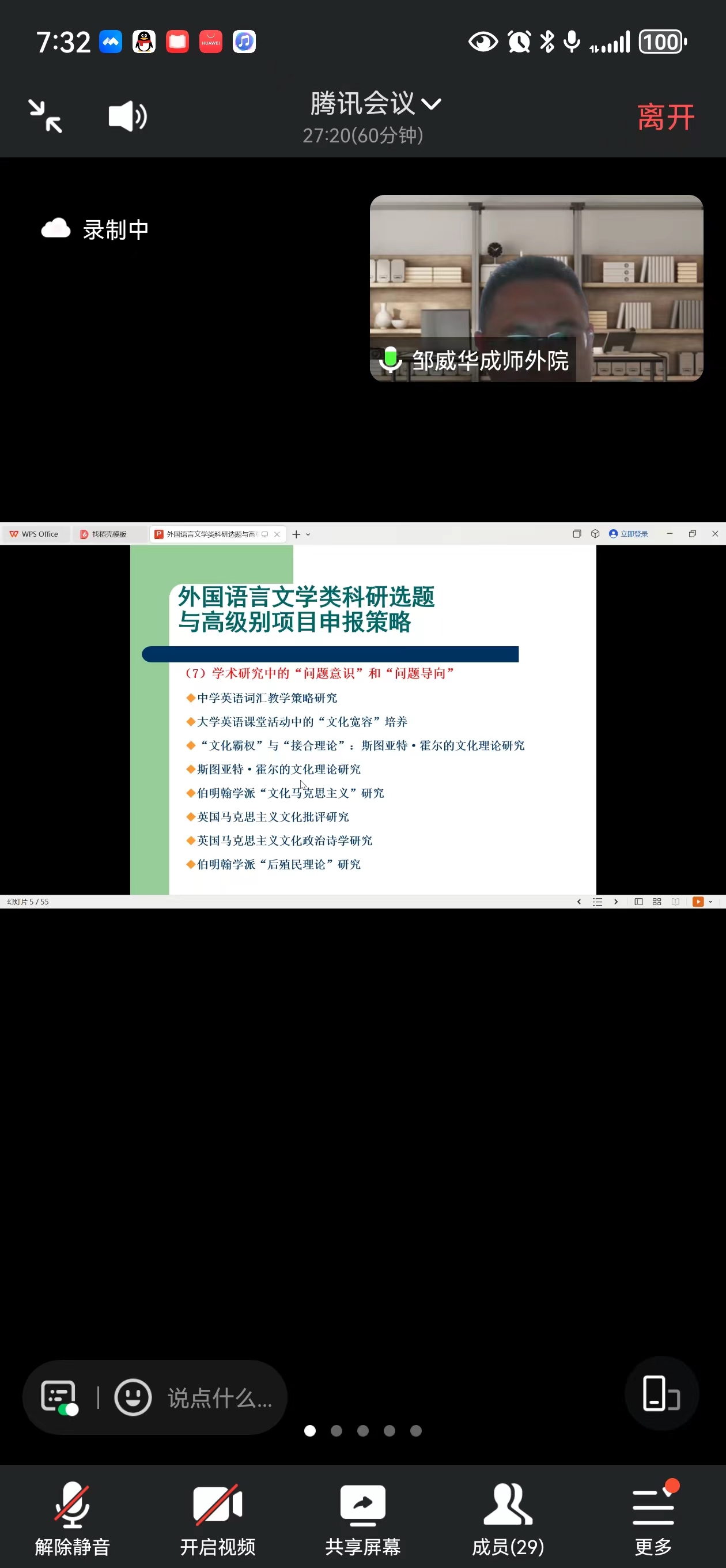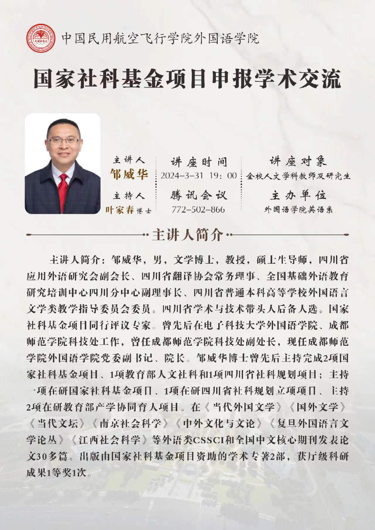 2024年3月31日晚上7点,beat365英国官网网站全院老师和研究生一起相聚云端,参加英语系主办的关于国家社科基金项目申报的学术交流活动。本次交流特别邀请成都师范学院beat365英国官网网站院长邹威华教授分享他的申报及评审经验。讲座由英语系叶家春博士主持,beat365英国官网网站院长肖凌教授及beat365英国官网网站师生参加了此次讲座。